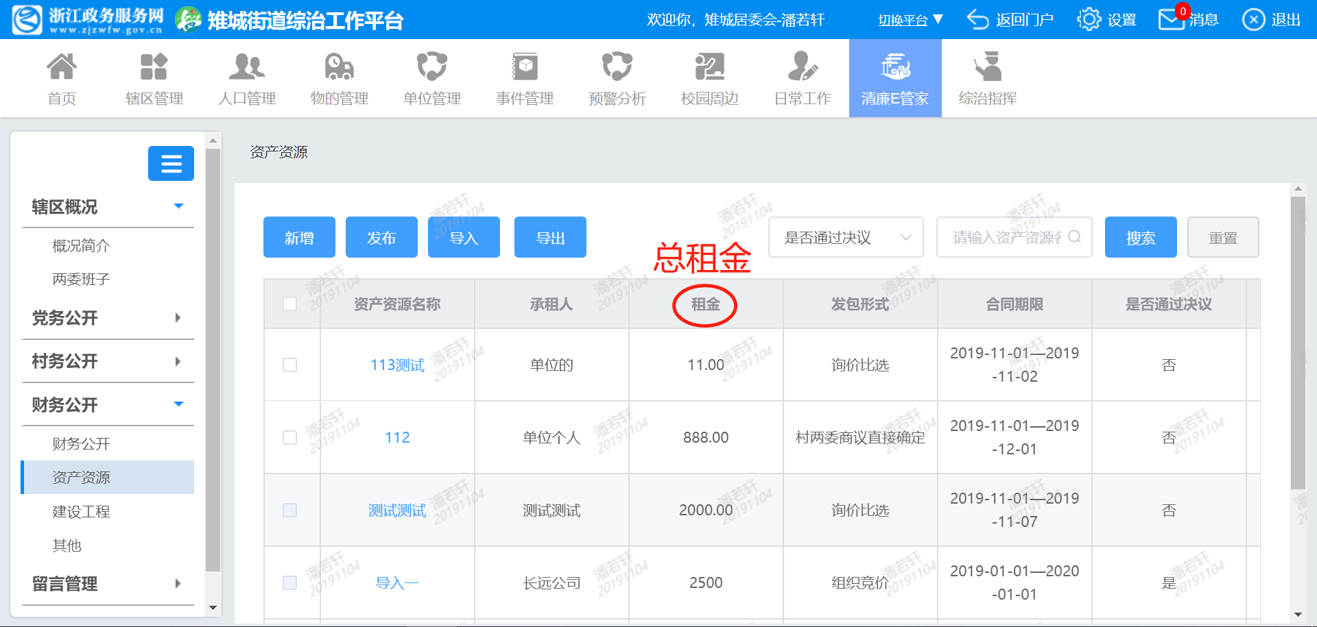 PC端-财务公开-资产资源,“租金”字段改为“总租金”,文本框内加单位“元”