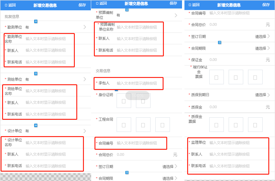 1,新增交易信息页面,所有清除按钮无法清除已输入内容。  2,新增工程页面,所有清除按钮无法清除已输入内容。  3,新增中标信息页面  4,新增合同信息页面