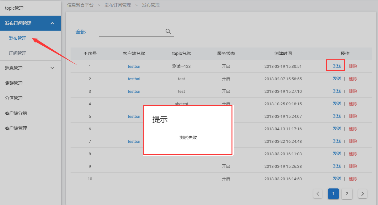 信息聚合平台-发布订阅管理-发布管理发布按钮弹窗提示:测试失败