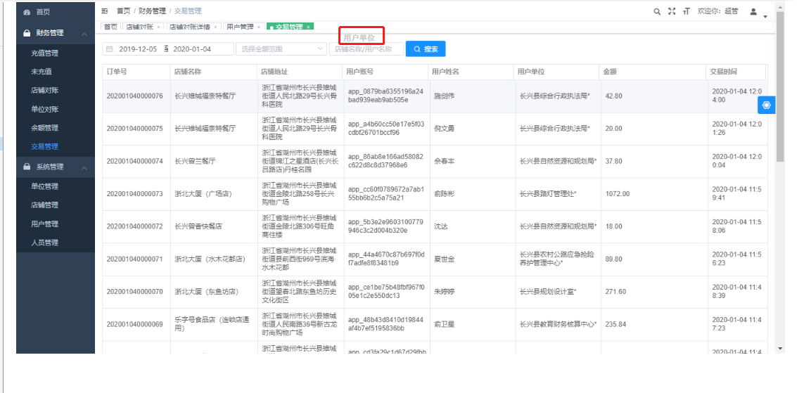解决办法:财务管理—交易管理新增按【用户单位】搜索